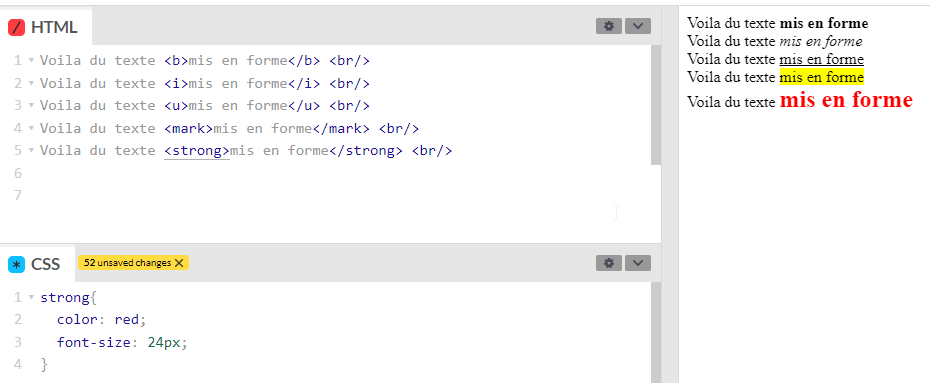 Si on utilise généralement CSS pour faire de la mise en forme, on est amené à utiliser des balises de mise en forme directement dans le code html, parmi lesquelles :