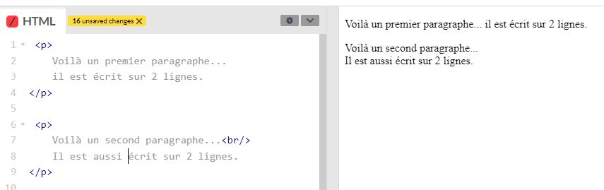 Pour passer à la ligne SANS créer un nouveau paragraphe, on utilise la balise orpheline <br>. Orpheline = pas de balise fermante.