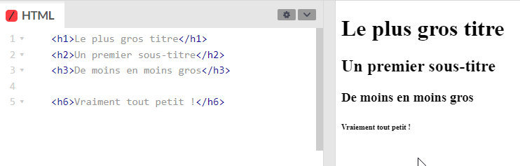 Le plus grand titre de la page sera "balisé" <h1> et il est possible d'aller jusqu'à <h6>.