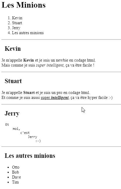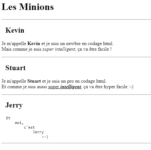 Important : le langage html ne tient pas compte des espaces. Si on veut ajouter des espaces, on peut utiliser différentes techniques décrites ici.